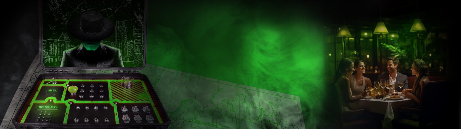 Het Escape Diner is ontwikkeld door onze eigen Game & Designafdeling en zit vol verrassingen. Het spel begint met een spectaculaire video-introductie van The Mask en onze showmasters. Daarna gaan jullie per tafel aan de slag met een mysterieuze, explosieve escape box.